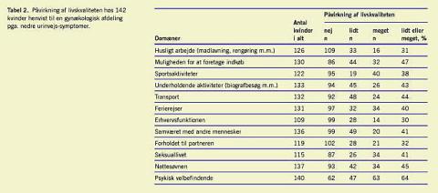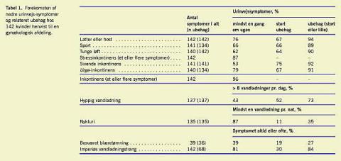 Materiale og metoder: Opgørelsen omfatter alle 174 kvinder, som i perioden fra den 1. november 1999 til den 1. august 2001 blev henvist for nedre urinvejssymptomer (NUS) til Gynækologisk Afdeling på Glostrup Hospital. Af disse 174 udfyldte 142 (82%) validerede spørgeskemaer om symptomhyppighed og livskvalitet og indgik dermed i undersøgelsen.