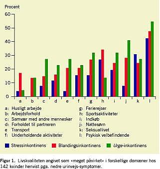 Et hundrede to og fyrre kvinder (82%) udfyldte spørgeskemaet og blev inkluderet i undersøgelsen. Kvindernes medianalder var 59 år (spændvidde: 22-89 år). Mange patienter (85%) havde daglige inkontinenssymptomer; hovedparten (97%) angav at have symptomer mindst en gang om ugen (Tabel 1). Få patienter havde ren stressinkontinens (15%) henholdsvis ren urge-inkontinens (18%). Fire ud af ti patienter (40%) rapporterede om en blanding af dagligt stress- og urge-inkontinenssymptomer, også kaldet blandingsinkontinens. Mange patienter havde andre NUS - specielt nykturi (87%) og imperiøs vandladningstrang (81%). To ud af tre patienter oplevede inkontinenstilstanden som et stort ubehag, og stort set alle patienter oplevede, at tilstanden udgjorde et ubehag i større eller mindre omfang (Tabel 1). Der var ikke signifikant forskel på graden af relateret ubehag hos patienter med urge- henholdsvis stressinkontinens (p > 0,05). Til sammenligning oplevedes inkontinenssymptomer som relativt mere ubehagelige end ikkeinkontinenssymptomer (Tabel 1). Der var stor forskel mht. forekomsten af de forskellige domæner af livskvalitet (Tabel 2). Mindst berørt var erhvervsfunktionen (en tredjedel angav en påvirkning) og mest berørt var den psykiske tilstand (to tredjedele angav en påvirkning). Figur 1 viser, at med undtagelse af sportslig inkontinens og i seksuel sammenhængen var urge- inkontinens oftere end stressinkontinens associeret med ubehag. Med undtagelse af variablen husligt arbejde fandtes symptomhyppigheden at være signifikant associeret med påvirkningen af livskvalitet: jo hyppigere symptom, des større påvirkning af livskvaliteten (Kruskal-Wallis test; p < 0,05).