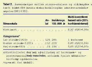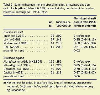 Gennemsnitsalderen ved indgangen i studiet var 57 år, og 10% af kvinderne rapporterede om højt stressniveau på dette tidspunkt. En større andel af de stressede kvinder var postmenopausale, brugte hormoner, havde et lavt uddannelsesniveau og et højt alkoholforbrug og var mindre fysik aktive end de mindre stressede kvinder (data ikke vist). I opfølgningstiden fik 251 kvinder primær brystkræft. Efter justering for andre betydende faktorer var både stressintensitet (p = 0,02 for trend) og stresshyppighed (p = 0,06 for trend) omvendt associeret med brystkræftrisiko (Tabel 1 ). For hver stigning i stress på den samlede stressskala var der en 8% lavere risiko (hazard ratio = 0,92; 95% konfidensinterval (KI): 0,85-0,99) for brystkræft (Tabel 2 ). Kvinder i den høje stresskategori havde 40% lavere risiko (hazard ratio = 0,60; 95% KI: 0,37-0,97) for at få brystkræft end kvinder i den lave stresskategori.