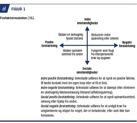 selvskadende end hos ikkeselv-skadende unge [7], og selvskade er blandt de væsentligste prædiktorer for selvmordsforsøg [8]. Risikoen er specielt stor, når selvskaden ikke længere kan nedregulere negative følelser. Ifølge Joiner [9] øger selvskadende adfærd selvmordsrisikoen ved at fungere som en »træning« i at