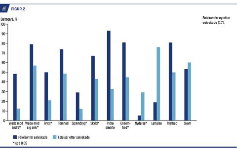 Affektregulering er det hyppigste motiv til selvskade [17]. En dansk undersøgelse har vist, at 76% af dem, der har skadet sig selv, har gjort det for at komme af med negative følelser, 45% for at straffe sig selv, 45% for at få opmærksomhed, 34% for at finde ud af, om der var nogen, der virkelig havde omsorg for dem, mens 30% angav, at de havde skadet sig selv for at skræmme andre [18]. I en undersøgelse af selvskadende patienter i psykiatrisk behandling blev deltagerne spurgt til følelser før og efter en episode med selvskade. En række negative følelser blev reduceret signifikant, mens nogle positive følelser blev øget med den selvskadende handling (Figur 2) [17]. Følelsen af skam var stort set uændret, hvilket hænger sammen med, at skamfølelsen kan både udløse en trang til selvskade og øges efter selvskaden. Det er vigtigt at afklare selvskadens funktion for den enkelte, fordi det har betydning for valg af fokus i behandlingen. Mange, der skader sig selv, har imidlertid svært ved at sætte ord på og differentiere den ene følelse fra den anden og udviser således tegn på nedsat mentaliseringsevne og aleksitymi [19]. Disse personer kan mærke en stigende følelsesmæssig spændingstilstand rent kropsligt og oplever en fysisk trang til f.eks. at skære sig. Den efterfølgende forløsning opleves både psykisk og fysisk, og nogle beskriver det som at »sprænge en ballon«, hvor ro og mental afspænding umiddelbart sætter ind.