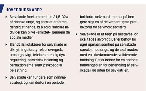 Selvskade har i de seneste 20-30 år fået stor udbredelse specielt blandt unge [1]. Psykosocial belastning og »social smitte« gennem de sociale medier er medvirkende faktorer [11]. Mellem 21,5% og 32% af de danske unge rapporterer om erfaring med direkte selvskade [1, 12]. De hyppigste former er at skære, slå og brænde sig selv, og de fleste bruger flere metoder [13].