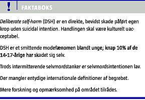 Selvskade forekommer langt hyppigere end selvmordsforsøg blandt unge [8, 17]. Dog har studier vist, at fra en fjerdedel og helt op til halvdelen af de unge, der udfører DSH, har haft selvmordstanker [1, 4, 15]. Et followup-studie har præsenteret lave suicidalhensigter bag 12-14-åriges veneficiumhandlinger. Således blev kun 16% scoret til at have en høj selvmordsintention, og i løbet af de 26 år, followup-studiet forløb, begik kun 1,1% af de 464 undersøgte selvmord [22] (Tabel 1 ).