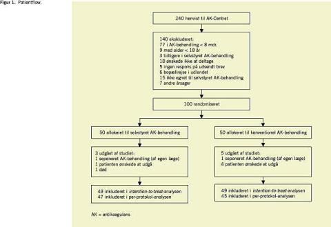 I den selvstyrende gruppe udgik tre patienter: en under træningsperioden (AK-behandlingen seponeret af behandlende læge), en under oplæring i selvstyret AK-behandling, og en døde i den primære observationsperiode. I den konventionelt styre de gruppe fik en patient seponeret AK-behandlingen af den behandlende læge i den primære observationsperiode, og fire patienter udgik under træning i selvstyret AK-behandling. De to patienter, som fik seponeret AK-behandlingen, blev ekskluderet fra analysen. I alt 98 patienter blev inkluderet i den primære endepunktsanalyse, og 92 patienter i den sekundære endepunktsanalyse. Der var ingen større komplikationer. Alle 92 patienter bestod eksamen efter 27 uger.