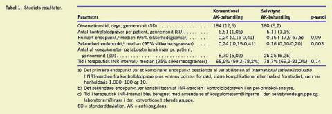 Sekundære endepunkter var variabiliteten af INR-værdien i kontrolblodprøven i en per-protokol analyse, og tid i terapeutisk INR interval blev beregnet med anvendelse af koagulometer målingerne i den selvstyrende gruppe og laboratoriemålinger i den konventionelt styrede gruppe.