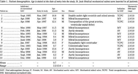 Resultater: Den gennemsnitlige opfølgningstid var 547 dage (spændvidde: 114-953 dage). Patienterne var inden for terapeutisk INR-niveau med en median på 65,5% af tiden (spændvidde: 17,5-90,4%). Ingen af patienterne oplevede tromboemboliske komplikationer eller blødningskomplikationer, som krævede lægelig intervention. Alle patienterne og deres forældre udtrykte fuld tilfredshed med behandlingen.