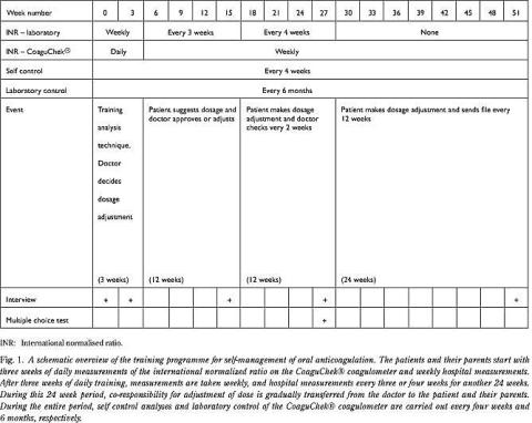 Hver patient startede oplæri ngsprogrammet med at øve analyse af blodprøverne. Patienterne tog derefter gradvist over mht. styringen af AK-behandlingen, initialt ved at foreslå VKA-dosis og herefter ved selv at dosere dosis under overvågning fra studiegruppen. Efter 27 uger gennemførtes en eksamen, hvor patienten demonstrerede sin evne til selvstyring, bl.a. vha. en multiple choice-test. De regelmæssige analyser af INR, der blev udført på laboratoriet, blev afsluttet, når denne test var bestået, og patienten blev betragtet som selvstyrende. INR-analyser blev foretaget en gang om ugen i hele studieperioden, og patienten skulle rapportere INR-værdierne og VKA-dosis til centret hver tredje måned.