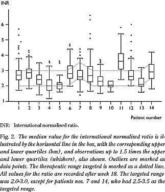 Alle patienterne var i stand til at anvende hjemmekoagulometeret på fuldt ud kompetent vis og var ved multiple choice-testen efter 27 uger i stand til at justere VKA-dosis. De udtrykte alle uforbeholden tilfredshed med selv at varetage AK-behandlingen. Ingen af patienterne oplevede tromboemboliske komplikationer eller blødningskomplikationer fraset mindre, ikke behandlingskrævende, subkutane hæmatomer. Patienterne var inden for terapeutisk INR-niveau med en median på 65,5% af observationstiden (spændvidde: 17,6-90,4%). Box-whiskers-plot er vist i Fig. 2 . Heraf ses, at den mediane værdi er inden for terapeutisk INR-niveau for 13 ud af 14 patienter.