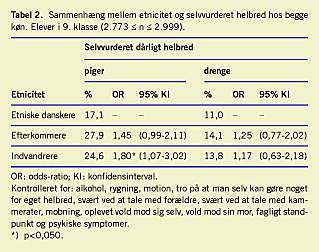 Materiale og metoder: I alt 6.203 elever i 9. klasse besvarede i 2002 et computerbaseret spørgeskema med fokus på de unges trivsel, sundhedsadfærd og seksuelle erfaringer. Undersøgelsen omfattede 264 indvandrere og 391 efterkommere af indvandrere fra ikkevestlige lande. Data om disse unges selvvurderede helbred er sammenlignet med tilsvarende data for unge af dansk oprindelse og kontrolleret for betydningen af en række risikofaktor for dårlig trivsel.