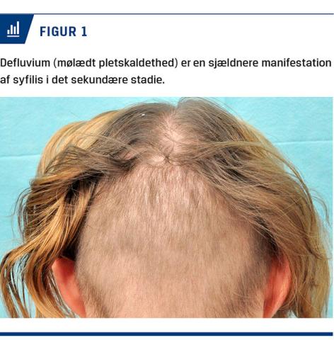 Først på tiendedagen efter sit første besøg i kønssygdomsklinikken blev patienten lumbalpunkteret i neurologisk regi, og ved første måling af cerebrospinalvæsken (CSV) fandt man et forhøjet celletal og proteinniveau (Tabel 1), hvilket var forenligt med neurosyfilis. Patienten blev indlagt og fik behandling med intravenøs injektion af benzylpenicillin i 14 dage. Under indlæggelsen fluktuerede hans symptomer på neurosyfilis, og der udvikledes defluvium (Figur 1).