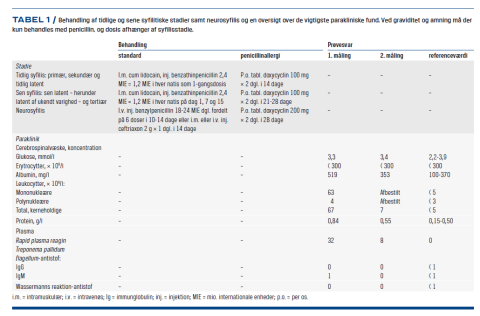 Hvis neurologiske symptomer vurderes at være relateret til en syfilisinfektion, bør der foretages lumbalpunktur på vid indikation – også i tilfælde af mistanke om behandlingssvigt.
