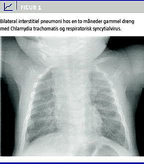 Summary Late debut of neonatal pneumonia caused by Chlamydia trachomatis Ugeskr Læger 2013;175(8):510-511 A newborn colonized with Chlamydia trachomatis will often show symptoms of conjunctivitis and/or pneumonia. We report a case of interstitial pneumonia caused by C. trachomatis in a 2-month-old boy admitted with RSV. We point to the importance of C. trachomatis in the differential diagnostics of an infant with respiratory symptoms even in the presence of additional infectious agents.