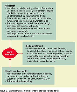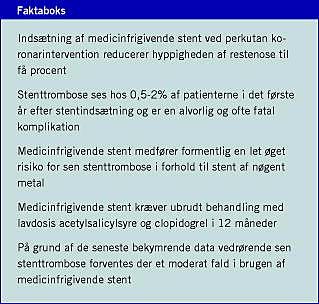 Akilleshælen ved perkutan koronarintervention (PCI) er udvikling af restenose. For at modvirke restenose, er PCI-evolutionen derfor gået fra ballondilatation til implantation af intrakoronare endoproteser, såkaldte stent, først af nøgent metal (bare metal stents, BMS), og fra 2003 medicinfrigivende (drug-eluting ) stent (DES), som frigiver medicin rettet imod restenose. DES medfører markant reduktion i hyppigheden af restenose i stenten og behovet for gentaget revaskularisering i forhold til BMS [1]. Stent er imidlertid trombogene, og lige siden man i 1986 indsatte den første stent har risikoen for stenttrombose (ST) luret i kulissen. Efter at man i midten af 1990'erne overgik til rutinemæssig højtrykimplantation af stenten, er ST i det tidlige forløb efter PCI faldet til < 1%, under dobbeltbehandling med lavdosis acetylsalicylsyre (ASA) og clopidogrel. ST er dog ikke blevet elimineret, og der er i de senere år stillet spørgsmål ved effektivitet og sikkerhed af DES [2]. I september 2006 brød sagen ud i lys lue, da der ved World Congress of Cardiology i Barcelona blev fremlagt kontroversielle data vedrørende sen ST med DES.