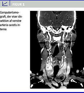 Ved neurologisk tilsyn blev der yderligere fundet venstresidig udglattet nasolabialfure som tegn på nervus facialis-påvirkning. Neurologen mistænkte dissektion af venstre arteria carotis interna eller arteria vertebralis. CT-angiografi viste dissektion af venstre arteria carotis interna, se Figur 1 .