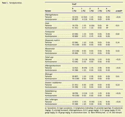 I dette studie havde 26% af patienterne moderate anorektale gener, der kompromitterede daglige funktioner. I et tidligere studie fandt man moderate anorektale gener hos 21% af patienterne, hvilket er sammenligneligt med data fra dette studie [15]. I dette studie rapporterede 39% af patienterne periodisk til vedvarende fækal urge, som hos 13% af patienterne var ledsaget af ugentlig eller hyppigere fækal inkontinens. I andre studier er der fundet fækal urge og inkontinens hos henholdsvis 22% til 50% og 23% til 27% af patienterne [15, 17, 18].