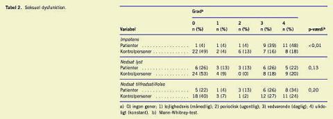 Hovedparten af patienterne havde registreret ændringer i seksualfunktionen, heraf rapporterede 39% af patienterne om moderate til svære gener. Sammenlignet med kontrolgruppen rapporterede flere patienter om erektiv impotens, hvorimod seksuel lyst og tilfredsstillelse ikke var signifikant forskellig (Tabel 2 og 3).