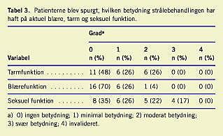 I det aktuelle studie rapporterede kun en patient (4%) om moderate blæregener efter strålebehandlingen (Tabel 3). I andre studier har man fundet moderate blæregener hos 15-20% af patienterne [15-17]. Signifikant flere patienter end i kontrolgruppen rapporterede om lettere dysuri og hæmaturi. Derimod var andre former for vandladningsdysfunktion ikke signifikant forskellig mellem grupperne. I et tidligere studie var konklusionen, at sene blærebivirkninger oftest opstår efter lang opfølgningstid [12]. Der kan derfor argumenteres for, at omfanget af blæregener er blevet underestimeret i denne undersøgelse, idet alle bivirkningerne ikke var prævalente på interviewtidspunktet.