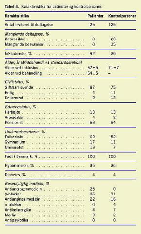 I undersøgelsen blev der inkluderet 23 patienter (92%) med en median opfølgningstid på 30 måneder (12-107 måneder). Fire patienter var behandlet med 66 Gy på 33 fraktioner, de resterende 19 patienter var behandlet med 70 Gy på 35 fraktioner. I kontrolgruppen blev 45 raske personer (36%) inkluderet. Tabel 4 illustrerer karakteristika for hver af grupperne. Sammenlignet med gruppen af patienter var kontrolgruppen ældre, og flere var enlige. Medicinforbruget i grupperne var sammenligneligt fraset brugen af antiandrogen medicin hos 25% af patienterne.