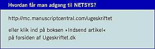 Alle, forfattere, bedømmere m.fl. får adgang til NETSYS på adressen: http://mc.manuscriptcentral.com/ugeskriftet. Man kan skrive adressen direkte i sin internetbrowser, eller man kan klikke ind på boksen »Indsend artikel« på forsiden af Ugeskriftet.dk.