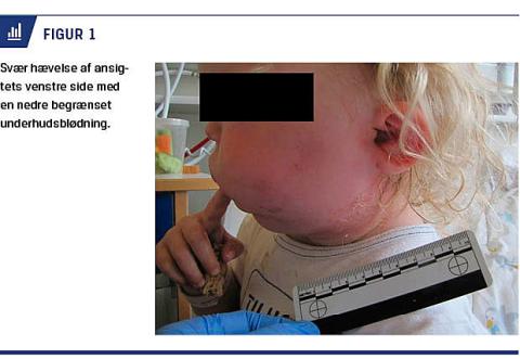 På sygehuset sås en svær hævelse af ansigtets venstre side med en nedre begrænsning bestående af en rødlig båndformet underhudsblødning (Figur 1). Der var ingen punktformede blødninger eller vejtrækningsproblemer.