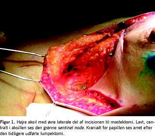 Ved reoperationen blev der efter præoperativ information og accept anvendt SN-procedure. Der blev fjernet en SN, og patienten blev mastektomeret. SN var mærket med 99mTc-Nanocoll i alt 118Mbq injiceret i fire depoter periareolært dagen før operationen. En lymfeskintigrafi efter to timer viste en lymfeknude i højre aksil. Under anæstesien blev der ti minutter forud for hudincisionen tillige givet 0,5 ml New Patent Blue intradermalt lige lateralt for lumpektomicikatricen. Lavt bag forreste aksillærfold (Figur 1 ) blev der fundet en blå lymfeknude med tælletal > 1.000, restaktivitet < 10, målt med Neoprobe 2000. Peroperativt frysesvar: lymfeknude uden malignitet, hvilket siden blev bekræftet i parafinpræparationen.
