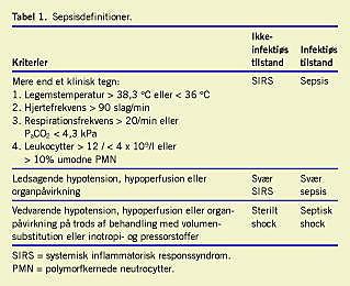Sepsisdefinitionerne er fortsat baseret på en konsensusbeslutning publiceret i 1992. De bygger på enkle kliniske og parakliniske variabler, og beskriver i tre trin sygdomstilstande med tiltagende organdysfunktion og mortalitet (Tabel 1 ). Da mortaliteten ved svær sepsis og septisk shock trods avanceret diagnostik og behandling fortsat er meget høj, 30-50%, om end dokumenteret aftagende, besluttede man i en række internationale videnskabelige selskaber at gennemføre en global kampagne, Surviving Sepsis Campaign (SSC).