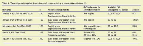 Der foreligger nu flere publikationer, hvor effekten af hel eller delvis implementering af sepsispakkerne valideres [3, 4]. De væsentligste undersøgelsesresultater fremgår af Tabel 1 , som viser, at mortaliteten falder ved implementering af sepsispakker. I undersøgelse 1-3 sammenholdtes mortalitet før og efter indførelse af sepsispakker med brug af historisk kontrol. I undersøgelse 4 og 5 sammenlignedes de patienter, hvor samtlige kvalitetsindikatorer var opfyldt, med dem, hvor ingen eller alene nogle af indikatorerne var opfyldt.