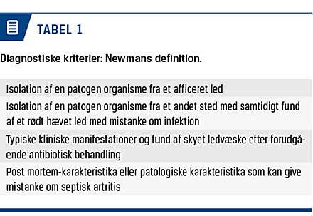SA defineres som infektion i et synovialt led. Der er ikke international konsensus om de diagnostiske kriterier, men hyppigst benyttes en modificeret udgave af Newmans definition (Tabel 1). Det hyppigst afficerede led i bevægeapparatet er knæleddet, efterfulgt af hofte-, skulder-, ankel-, albue- og håndled, men alle synoviale led, herunder de store led i columna, kan afficeres [4-7].