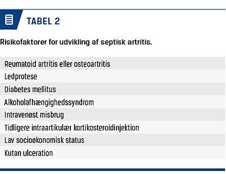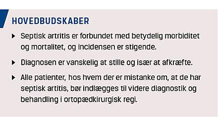 Septisk artritis (SA) er en vigtig differentialdiagnose hos patienter, der har akut opstået monoartikulær eller polyartikulær artritis. Hurtig diagnostik og behandling kan begrænse morbiditet og mortalitet ved SA [1].