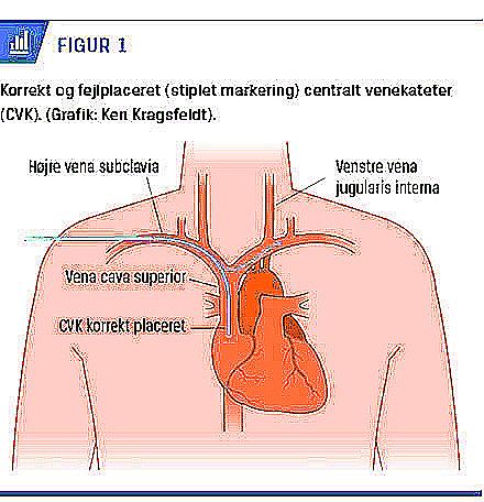 Når der er behov for intravenøs infusion af et større volumen af medikamenter eller blodprodukter og/eller behov for en længerevarende behandling, er et centralt venekateter (CVK) velegnet. Det er oftest anæstesiologer, som har ansvaret for anlæggelsen af CVK, mens det er det kliniske personale på afdelingerne, som administrerer den intravenøse behandling og dermed også har ansvaret for observationen under og efter infusion. Via indstik i højre vena jugularis interna/externa eller vena subclavia indføres kateteret til vena cava superior eller til højre atrium (Figur 1).