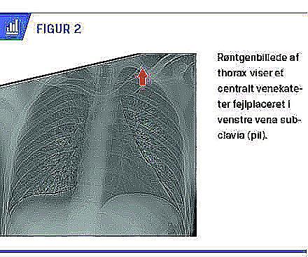 Først flere dage senere, efter gentagne registreringer af alle symptomer i den elektroniske patientjournal, gav det anledning til evaluering af tidligere røntgenoptagelser af thorax, og det blev konstateret, at CVK’et var fejlplaceret i venstre vena subclavia (Figur 2).
