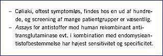 En meget væsentlig klinisk udfordring er således at finde de patienter med CD, der ikke frembyder klassiske symptomer og tegn (diaré, vægttab, meteorisme og abnorm biokemi), men enten helt atypiske eller slet ingen symptomer, eventuelt helt andre relaterede tilstande (Tabel 1 ). Der kan argumenteres for CD-screening af den generelle befolkning [5]. CD opfylder WHO's massescreeningskriterier idet: 1) tidlig klinisk diagnose kan være vanskelig, 2) CD er en hyppig sygdom, der fører til mulig betydelig morbiditet i den generelle befolkning, 3) tilgængelige screeningsmetoder er meget sensitive og specifikke, 4) der findes en effektiv behandling (glutenfri diæt (GFD)) og 5) uopdaget kan CD medføre livstruende og vanskeligt traktable komplikationer, bl.a. intestinalt lymfom og adenokarcinom i tyndtarmen samt osteoporose. Eftersom vor opfattelse af sygdommens naturhistorie måske er under ændring, og der ikke findes gode cost-benefit-analyser på området, er holdningen indtil videre afventende.