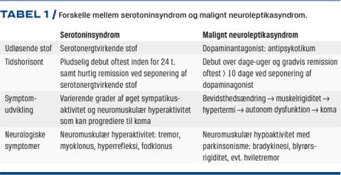 Serotoninsyndrom er en sjælden neuropsykiatrisk tilstand, der skyldes medicin, som forhøjer serotoninniveauet i centralnervesystemet og medfører en overstimulering af serotoninreceptorerne, særligt subtyperne 5-HT1A og 5-HT2A [1, 2]. Typisk er autonome symptomer (svedtendens, hjertebanken og diarré), konfusion og neuromuskulær hyperexcitabilitet (tremor, hyperrefleksi og spontan klonus) [1]. Serotoninsyndrom ses hyppigst, når to eller flere serotonergtvirkende midler kombineres, f.eks. antidepressiva (selektive serotoningenoptagelseshæmmere, lithium og tricykliske antidepressiva), medicin mod parkinsonisme (levodopa og monoaminoxidasehæmmere), migrænemedicin (sumatriptan), eller ved misbrug (af amfetamin, ecstasy, kokain og/eller lysergsyrediethylamid) [1].