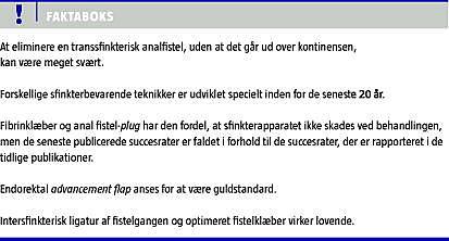 Målet med behandling af transsfinkteriske anale fistler er en eliminering af fistelgangen med bevaret funktion. Udviklingen af nye sfinkterbevarende teknikker har ofte været fulgt af høje succesrater initialt. Entusiasmen har en tendens til at dæmpes noget med tiden pga. varierende resultater. Optimeret fistelklæber med skræddersyet behandling til den enkelte patient og LIFT-proceduren med eller uden en bio-mesh -interponering i det intersfinkterisk rum er de mest interessante tiltag i øjeblikket. Disse nye behandlinger bør undersøges i randomiserede studier med sufficient power- beregning.