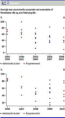 En AFP består af et kollagent netværk. Produktet er udvundet fra submucosa i grisens tyndtarm. I lighed med fibrinklæber var de første rapporter om behandlingen meget optimistiske med succesrater på omkring 80%. I en litteraturoversigt fremgår det, at de initiale resultater ikke har været reproducerbare, og at variationen i succesrater er stor (Figur 1B). Årsagen til variationen findes formentlig i patientselektionen, den kirurgiske teknik og opfølgningen både i tid og metodevalg.
