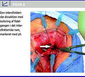 Man anbefaler en forbehandling med løs seton i 2-3 måneder. Det er vigtigt, at man i den periode opnår en veletableret, velorganiseret fistelgang, som tåler dissektion i det intersfinkteriske rum. I forbindelse med operationen erstattes den løse seton med en sonde. Metoden går ud på, at man åbner ind til det intersfinkteriske rum ved den intersfinkteriske fure. Fistelgangen med sonden identificeres, to ligaturer føres rundt, sonden fjernes, man ligerer, og afslutningsvis deler man fistelgangen (Figur 2 ). Nogle foreslår, at man udfør en lille resektion af fistelgangen [15]. Ingen muskelfibre deles under proceduren.