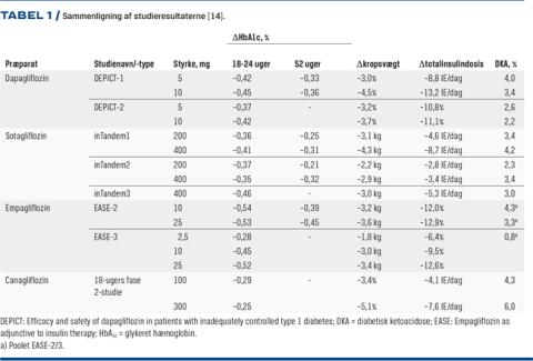 Ved behandling med dapagliflozin udviklede 1-4% af deltagerne med T1D i de randomiserede forsøg DKA, sammenlignet med 0-1,9% i placebogrupperne, dog uden dødsfald [1, 8, 9]. Mere præcise tal for risikoen for DKA findes i DEPICT-1, 52-uger-studiet, hvor risikoen for definitiv adjudikeret DKA var på hhv. 4,0%, 3,4% og 1,9% for 5 mg og 10 mg dapagliflozin samt placebo [8]. Ved behandling med sotagliflozin udviklede 3% DKA versus 0,6% for placebogruppen, også her uden dødsfald [2]. For empagliflozin udviklede 0,8%, 4,3% og 3,3% DKA for hhv. 2,5 mg, 10 mg og 25 mg versus 1,2% for placebo. Et tilfælde af ketoacidose havde dødelig udgang i gruppen, der blev behandlet med empagliflozin 25 mg [12]. For canagliflozin var andelen med ketoacidose 4,3% og 6,0% for 100 mg og 300 mg versus 0,0% for placebo uden nogen dødsfald [13].