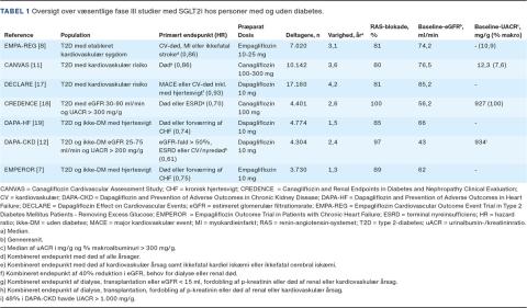 De væsentligste studier er resumeret i Tabel 1. CREDENCE-studiet [18] var det første, der undersøgte SGLT2i-behandling i en T2D-population med CKD med en estimeret glomerulær filtrationsrate (eGFR) på 30-90 ml/min/1,73 m2, en urinalbumin-/kreatininratio (UACR) på 300-5.000 mg/g ved baseline og med et primært endepunkt fokuseret på progression af nyresygdom. Studiet viste en 30% risikoreduktion i det primære sammensatte endepunkt (terminalt nyresvigt, fordobling af p-kreatininniveau eller død af nyre- eller kardiovaskulær årsag). Hos de 174 deltagere med eGFR < 30 ml/min/1,73 m2 ved baseline havde behandlingen samme effekt og sikkerhedsprofil som i den øvrige population [20].