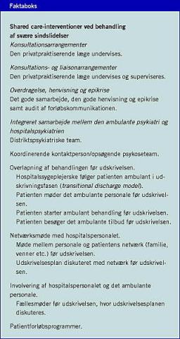 Flertallet af de publikationerne, der omhandler shared care- interventioner ved behandling af svære sindslidelser, viser divergerende resultater. Shared care synes at medføre en forbedret psykiatrisk service, men udbyttet for patienterne er moderat. Der er flere forklaringer på den moderate effekt. For det første kan holdningen blandt fagpersoner have betydning for samarbejdets succes, og for det andet kan manglende sammenhæng i implementeringsstrategien have betydning. Endelig må det fremhæves, at shared care bliver mere effektiv, hvis alle dimensioner herunder både tværgående samarbejde mellem primær -og sekundærsektoren samt mellem hospitals- og ambulantsektoren inddrages på samme tid. Gennemføres shared care- programmer kun i sekundærsektoren, risikrere man en »monopolisering« af den psykiatriske patient. Aktørerne i primærsektoren risikerer så at miste de basale kundskaber, der skal til for at kunne varetage behandlingen af patienterne, og de vil derfor henvise til sekundærsektoren, hvilket i sidste ende vil medføre ventelister og dermed en utilstrækkelig indsat over for patienter med svære sindslidelser.