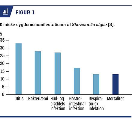 S. algae er en gramnegativ stav, der relativt sjældent fører til infektioner hos mennesker [1]. Den væsentligste kilde til Shewanella-infektion er varmt badevand [1, 2]. Kronisk syge personer, inklusive immunkompromitterede patienter, er særligt disponerede [1], hvorfor Shewanella-infektion minder om andre infektioner, som er forårsaget af varmtvandsbakterier såsom Vibrio og Aeromonas.