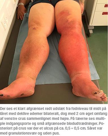 Objektivt fandtes han at være upåvirket, subfebril og havde fine vitalparametre. På venstre ben sås et velafgrænset rødt udslæt fra fodniveau til midt på låret. Området var varmt og palpationsømt. Der var deklive ødemer bilateralt dog med 2 cm øget omfang af venstre crus. På tæerne sås multiple indgangsporte samt små afgrænsede blodudtrædninger. Posteriort på crus fandtes et ulcus uden pus.