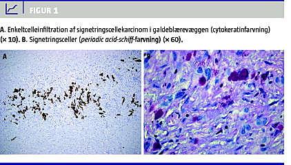 For at komme diagnosen nærmere udførte man laparoskopisk ultralydskanning, og denne blev tolket som inflammation i galdeblæren, ligamentum hepatoduodenale og retroperitoneum. Der blev taget frysebiopsier, som viste inflammation uden entydig diagnose. Der konverteredes herefter til åben operation, hvor man makroskopisk fandt tegn på inflammation ved galdeblæren, pancreas, ligamentum hepatoduodenale, duodenum, i retroperitoneum, høj-residige nyrepelvis, omentum majus og mesocolon transversum. Nye frysebiopsier fra galdeblæren viste karcinom, og de øvrige frysebiopsier fra de nævnte områder viste inflammation og malignitetssuspekte celler. For at aflaste patienten valgte man at udføre pallierende kirurgi med kolecystektomi og gastro-entero-anastomose. Makroskopisk fandt man en 3,5 × 6 cm stor galdeblære med en vægtykkelse på 3-9 mm. I lumen fandt man flere konkrementer, men der var ingen øget forekomst af slim. Histologisk var der dysplasi i epitelet i galdeblæren og diffus infiltration af tumorceller i galdeblærevæggen. Tumorcellerne var ordnet som små kirtelstrukturer og i små cellegrupper. Cellegrupperne forekom både i strenge og som enkeltceller, herunder signetringsceller. Signetringsceller indeholder mucin, hvorved cellekernerne displaceres perifert i cellerne, og giver det karakteristiske udseende som vist i Figur 1 A+B. Der blev foretaget immunhistokemiske farvninger for at belyse tumorens primære udgangspunkt. Tumorcellerne var positive i slimfarvning ( periodic acid-schiff ) samt caudal related homeobox gene 2 , cytokeratin 7, cytokeratin 20, mucinglykoprotein 2 og mucinglykoprotein 5 og negative i østrogenreceptor, tyroid transkriptionsfaktor 1, Wilms tumor-protein 1 og paired box gene 8 . Immunprofilen var således forenelig med en tumor med udgangspunkt i den øvre gastrointestinalkanal, mens metastase var mindre sandsynlig. Baseret på konstateringerne af dysplasi i galdeblæreepitelet, udbredt forekomst af tumorvæv i galdeblærevæggen, det karakteristiske udseende, vækstmønsteret og immunprofilen blev tumoren klassificeret som primær galdeblærecancer af typen signetringscellekarcinom. Det postoperative forløb var ukompliceret, og patienten fik kemoterapi, men efter få måneder afbrød man behandlingen på grund af forværring i tilstanden. Patienten gik ad mortem knap et år efter første indlæggelse, og der blev ikke udført obduktion.