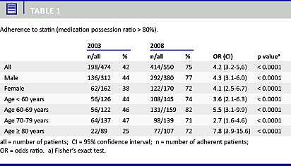 Uafhængigt af alder og køn var der i 2008 (75%) signifikant flere patienter med statinkomplians > 80% end i 2003 (42%) (p < 0,0001). Den mest signifikante forskel var blandt patienter > 80 år, hvor komplians blev tredoblet (fra 25% til 72% (p < 0,0001)).