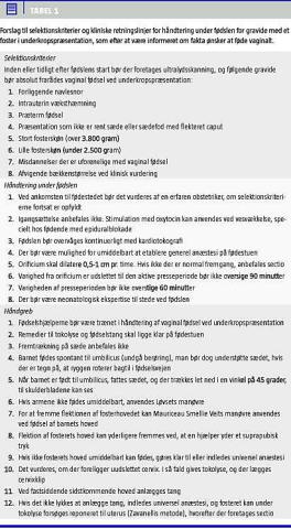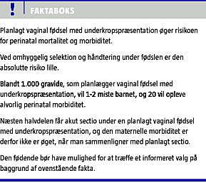 Vaginal fødsel ved underkropspræsentation (UK) er forbundet med en større risiko for asfyksi og fødselstraumer end fødsel ved hovedstilling. Det skyldes en hyppigere forekomst af intrauterin væksthæmning (IUGR) og risiko for afklemning og fremfald af navlesnoren. Endvidere er der risiko for besværlig fødsel af fosterets arme og hoved. Dette har ført til anbefaling af sectio ved UK - også i en tid, hvor indgrebet var forbundet med en betydelig maternel morbiditet [1, 2]. I talrige små retrospektive studier har man konkluderet, at planlagt vaginal fødsel er sikker, hvis den fødende opfylder en række nærmere definerede kriterier. Undersøgelserne er dog præget af små materialer, og samles resultaterne i metaanalyser, bekræftes den øgede risiko for perinatal død, lav Apgar score og fødselstraumer [3]. I år 2000 publicerede The Lancet resultaterne fra The Term Breech Trial (TBT), der er en stor international, randomiseret og kontrolleret multicenterundersøgelse [4]. TBT blev stoppet efter inklusion af 2.083 kvinder, idet man i en interimanalyse havde fundet øget mortalitet og morbiditet i gruppen, som var randomiseret til vaginal fødsel. TBT har efterfølgende været kritiseret for såvel den interne som den eksterne validitet i undersøgelsen [5]. Væsentlige indvendinger har været, at selektionen af fødende, som var egnede til vaginal fødsel, var suboptimal, f.eks. var der ikke krav om ultralydsskanning, og flere af de perinatale dødsfald var relateret til udiagnosticeret IUGR. Ved håndteringen under fødslen krævedes ikke kontinuerlig overvågning med kardiotokografi (CTG). Desuden tillod retningslinjerne for progressionen, at der gik 3,5 time, fra orificium var udslettet til barnets fødsel. En opfølgning, der omfattede halvdelen af de børn, der havde svær perinatal morbiditet (n = 18) i toårsalderen, viste ingen forskel med hensyn til neurologiske handikap [6]. Det bør dog fremhæves, at studiet var designet og styrkeberegningerne foretaget med henblik på at undersøge forskelle i den perinatale mortalitet og morbiditet. Undersøgelse af langsigtede komplikationer ville have krævet inklusion af langt flere fødende. Resultaterne fra TBT bekræfter den viden, der foreligger fra deskriptive studier om en øget relativ risiko ved planlagt vaginal fødsel. Studiet er sammen med to ældre små randomiserede studier grundlag for en Cohraneanalyse med samme konklusion [7]. Undersøgelsen har haft stor international betydning. I Danmark faldt hyppigheden af vaginal fødsel ved UK fra 20% til under 10%, efter undersøgelsen blev publiceret [3]. TBT giver dog næppe noget brugbart estimat for den absolutte risiko ved vaginal fødsel i sammenhænge, hvor der er strikte retningslinjer for selektion og for håndtering af fødslen. Et langt bedre grundlag for at rådgive danske fødende kan findes i epidemiologiske studier fra Europa [3, 8-10]. I studier fra såvel Danmark som Norge og Sverige har man fundet en øget risiko for lav Apgar score ved planlagt vaginal fødsel [3, 8, 9]. Der er imidlertid uenighed om, hvorvidt risikoen er klinisk relevant. Således konkluderer man i en undersøgelse fra Norge, at vaginal fødsel er sikker, mens det i danske og svenske studier fremhæves, at den fødende bør informeres om den øgede risiko. På grundlag af skandinaviske studier og en stor prospektiv dataindsamling fra afdelinger i Frankrig og Belgien [11] kan det konkluderes, at ved planlagt vaginal fødsel er den absolutte risiko for perinatal død øget med 1-2 promille, og for alvorlig neonatal morbiditet er den øget med 20 promille. I et dansk followupstudie af børn, der var født i UK, var hyppigheden af lav Apgar score og et efterfølgende handikap tre promille efter planlagt vaginal fødsel og 0,2 promille efter planlagt sectio [12].