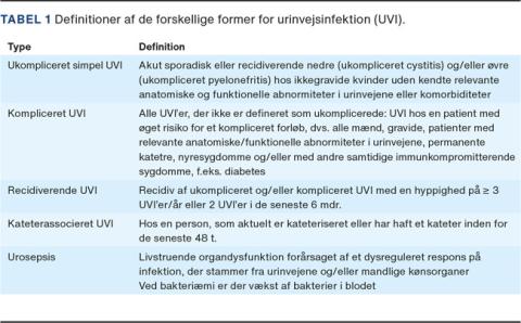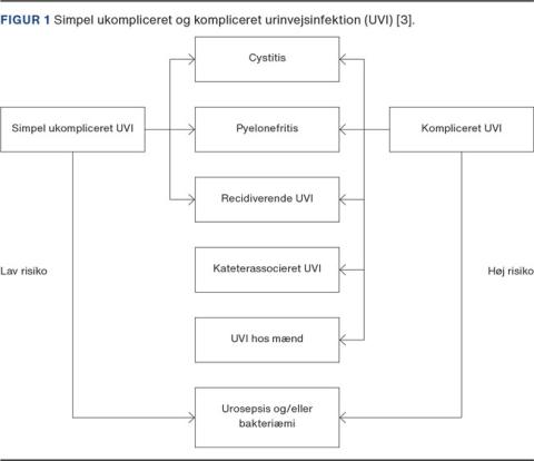 Urinvejsinfektion (UVI) er en kolonisering af urinvejene med uropatogene bakterier, hvilket medfører et inflammatorisk respons. De mest almindelige uropatogene bakterier er Escherichia coli, Klebsiella pneumoniae, Enterococcus faecalis og Proteus mirabilis [1, 2]. Det kliniske billede er meget varierende, fra ukompliceret simpel UVI hos raske, unge kvinder til kompliceret UVI hos mænd, hos ældre, hos personer med neurogen blære, urinvejsabnormiteter eller urinafledning, hos immunsupprimerede patienter, f.eks. transplanterede og personer med diabetes og ved kateterrelateret UVI (Tabel 1). Kompliceret UVI er en hyppig årsag til øget morbiditet og indebærer risiko for urosepsis, nyresvigt og død (Figur 1) [3].