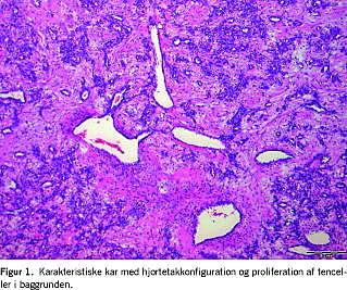 Glomangiopericytomer vokser submukøst og er dækket af intakt respirationsepitel. Tumorvævet er cellerigt og indeholder tæt voksende kar og tenceller, der er arrangeret i storiformt eller spiralsnoet mønster. Der findes vaskulære rum af forskellige størrelser med hjortetakkonfiguration (Figur 1). Nekrose er sjælden.