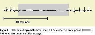 Patienten var en 63-årig mand, som igennem 43 år havde haft tilfælde af palpitationer, synkoper og nærsynkoper. Han blev frem til 1995 fulgt hos en speciallæge i kardiologi og fra 1998 i kardiologisk ambulatorium for paroksystisk atrieflimren. Man har igennem årene behandlet med betablokker, calciumantagonist og senest flecainid. Under flecainidbehandlingen udvikledes der bifascikulært grenblok. Under forløbet blev patienten nøje udredt, og man fandt normale elektrolytter, normal ekkokardiografi samt normale forhold ved arbejds-elektrokardiogram (EKG) og myokardiescintigrafi. Gentagne holtermonitoreringer viste episoder med selvlimiterende atrieflimren, men ingen pauser i hjerterytmen. Da patienten var meget utryg ved sin situation blev han indlagt til seponering af antiarytmisk medicin under telemetriovervågning. I forbindelse med indlæggelsen foretog man carotismassage. Patienten fik herunder en 11 sekunders pause i hjerterytmen (Figur 1 ), recidiv af symptomerne og kortvarigt bevidsthedstab. Diagnosen sinus caroticus-syndrom blev således stillet efter 43 år. Patienten fik implanteret en pacemaker, og siden har der ikke været synkoper.