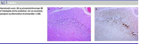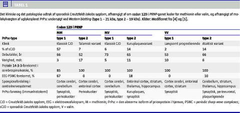 Sporadisk CJD udgør 85% af prionsygdommene, og de resterende tilfælde fordeler sig med 10% på familiære og 5% på iatrogene tilfælde, mens antallet af variant CJD tilfælde på globalt niveau er under 200. I Tabel 1 er anført det kliniske og patologiske udtryk af sporadisk CJD, afhængigt af om codon 129 i PRNP koder for methionin (M) eller valin (V) og molekylvægten af uglycosyleret PrPsc undersøgt ved Western blotting (type 1 ~ 21 kDa og type 2 ~ 19 kDa). Patienten i herværende kasuistik havde progredierende neurologiske symptomer, initialt cerebellare og visuelle symptomer og senere demens og myoklonus. Diagnosen blev bestyrket ved fund af protein 14-3-3 i cerebrospinalvæske. Denne test har varierende sensitivitet ved de forskellige undertyper, men er oftest positiv ved sporadisk CJD af ataktisk type [4]. De for CJD karakteristiske EEG-forandringer, periodic sharp wave complexes (PSWC), var ikke til stede, hvilket jævnligt er tilfældet ved sporadisk CJD af ataktisk type [4]. Neuropatologisk undersøgelse viste spongiforme forandringer med forekomst af PrPsc, primært i cerebellum. Ved cerebellar lokalisation af de patologiske forandringer er differentialdiagnosen Gerstmann-Sträussler-Scheinkers sygdom en af de familiære prionsygdomme, som tillige er karakteriseret ved forekomst af amyloide plaques [3, 5]. Sygehistorien illustrerer det kliniske billede og de patologiske forandringer ved sporadisk CJD af ataktisk type.