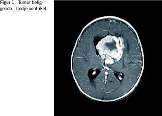 En seks måneder gammel pige blev akut indlagt pga. idelige opkastninger, der efterhånden var af eksplosiv karakter. Hun havde skrantet i en uge, spist sparsomt, gylpet mere end vanligt og været subfebril. Ved indlæggelsen var hun afebril, men slap og sløv. Efter et halvt døgns indlæggelse fik hun et tonisk krampeanfald. Kramperne blev brudt med sup. stesolid klysma. Der fandtes nu pupildifferens med dilateret venstre pupil, der reagerede trægt for lys. Akut computertomografi af cerebrum viste en stor tumor i tredje ventrikel. Lateralventriklerne var voldsomt dilaterede. I begge hemisfærer sås ødem og begyndende inkarceration.