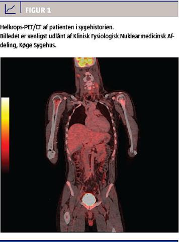 En objektiv undersøgelse viste normale forhold bortset fra knuden, som målte 5 × 10 × 15 mm. Ved en UL-skanning sås en velafgrænset cystisk proces bag højre m. sternomastoideus. En finnålsaspiration viste talrige maligne celler, men man kunne ikke sige, om cellerne stammede fra patientens hjernetumor eller fra en ny primærtumor. En PET-CT viste malignitetssuspekte lymfeknuder på begge sider af halsen, øget aktivitet i områder med rød knoglemarv og akkumulation i venstre os ilium (Figur 1). Der var altså ingen oplagte primærtumorer i nærheden af knuden på halsen. Knuden blev derfor fjernet med henblik på histologi, som viste, at det morfologisk og immunhistokemisk drejede sig om en metastase fra patientens ODG. Biokemiske undersøgelser viste trombocyto- og leukopeni, og efter fjernelse af knuden blev patienten indlagt på hæmatologisk afdeling på mistanke om hæmofagocytose. En knoglemarvsbiopsi viste metaplastisk tumorvæv med morfologi og markørprofil som ved ODG. Patienten blev sat i kemoterapi med temozolomid.